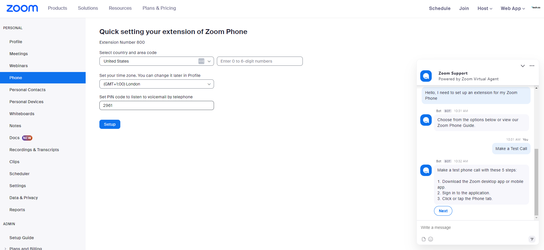 Testing out the Zoom Phone chatbot. Source: Tech.co testing