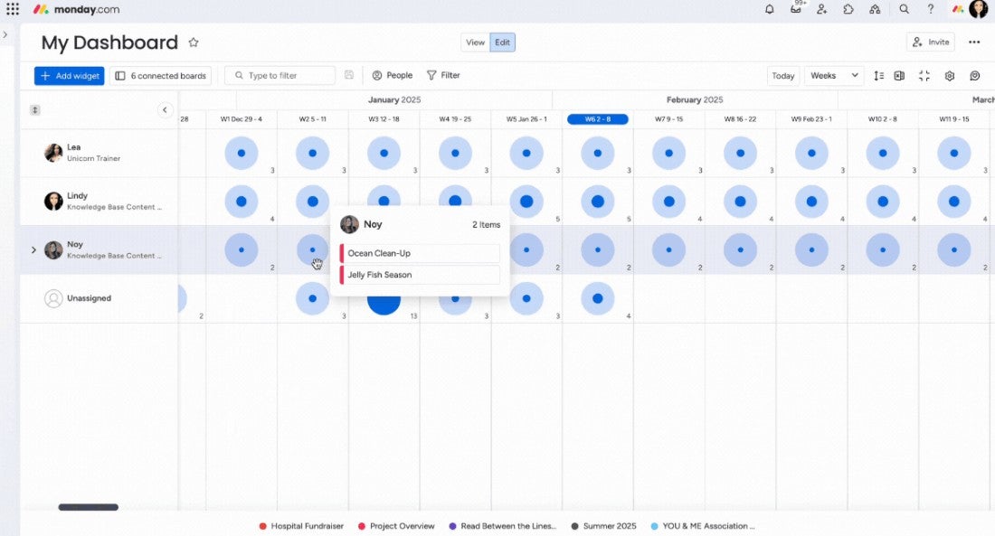 The Workload board allows users to view the allocation of resources in a comprehensive and intuitive way. Source: monday.com