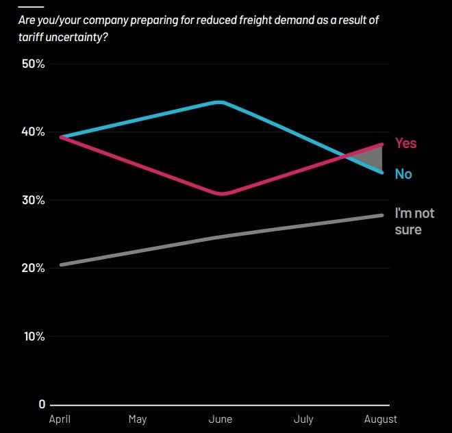 In our survey, we found that 38% of businesses say that they are preparing for reduced freight demand as a result of tariff uncertainty. However, these numbers have fluctuated substantially over the last few months, with only 31% stating the same in June and 39% in April. This is likely due to the freight frontloading that occurred at certain points this summer, to keep costs low before more tariffs went into effect.