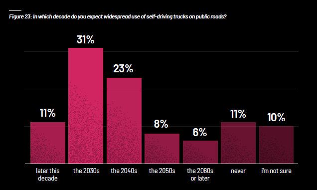 In total, though, that means that 65% of logistics professionals believes that autonomous vehicles will see widespread use on public roads before the year 2050. And given we’re only 25 years off and many companies are already deep into testing the technology, that feels like a pretty safe bet.
